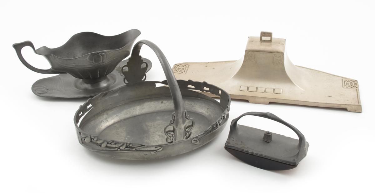 A Liberty Tudric Pewter tray, designed by Archibald Knox, model no.0359, elliptical form with overslung handle, pierced foliate rim, a WMF electroplated desk inkwell and pen tray, and two other pewter items stamped marks to tray 23.5cm. wide