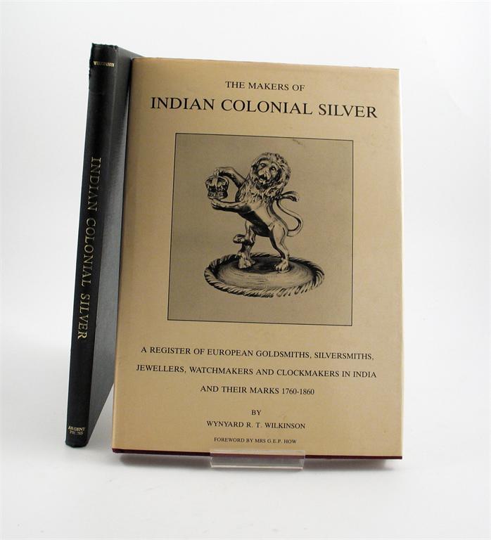 Wilkinson, Wynyard R.T., Indian Colonial Silver, European Silversmiths in India (1790 - 1860) one of a limited edition of 1000, Argent Press, London 1973, (green cloth boards) together with The Makers of Indian Colonial Silver, A Register of European Goldsmiths, Silversmiths, Jewellers, Watchmakers and Clockmakers in India and Their Marks 1760 - 1860, by the same author, with dedication, privately printed, one of a limited edition of 1000, 1987, dust wrapper. (2)