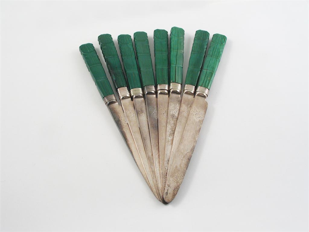 A set of eight George III dessert knives, with green-stained, carved ivory handles and 'finger-point' blades, initialled "R", by either Mark Bock or Moses Brent, London 1796. (8)