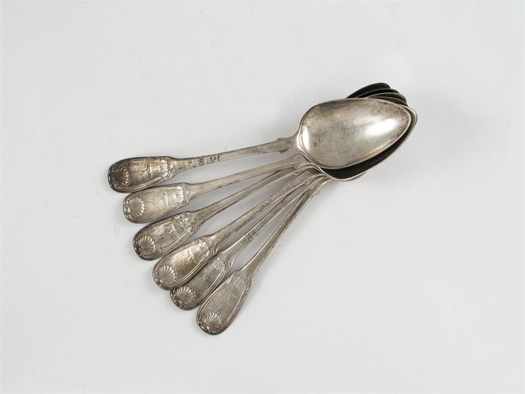 A set of six George III Scottish dessert spoons, with a fiddle, shell and scroll decoration (single struck), crested, by Robert Gray & Sons (of Glasgow) hallmarked, Edinburgh 1812, 7.5oz. (6)