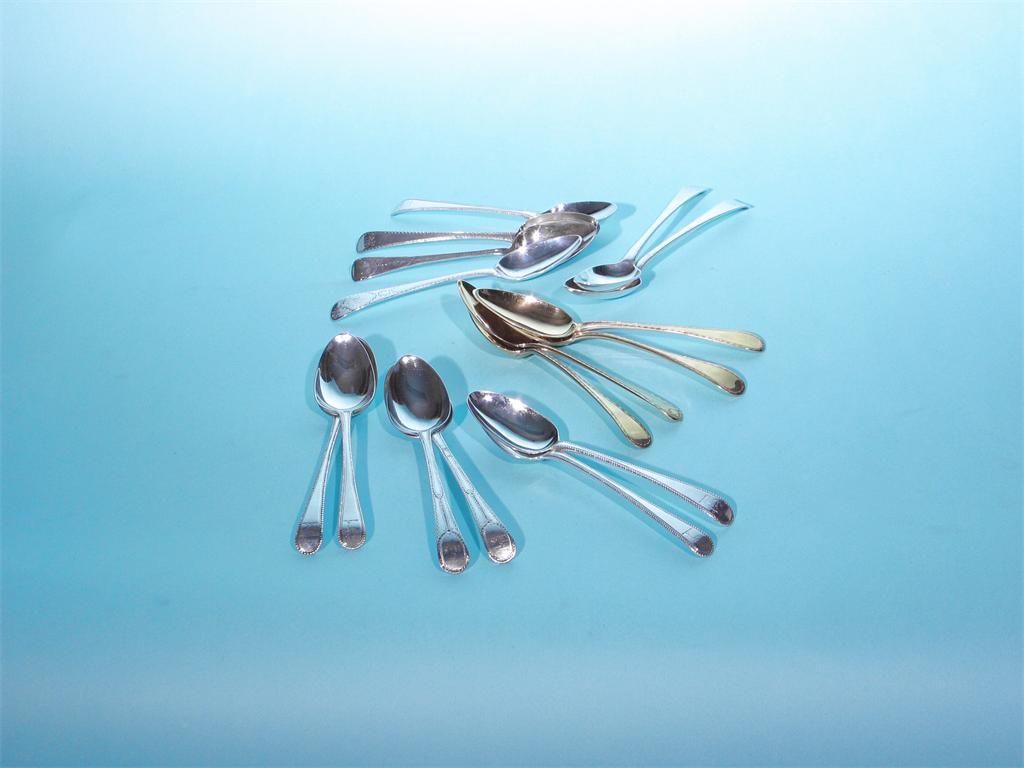 Sixteen George III tablespoons including: a pair and one single bead pattern example (all crested to match), a pair of bright-cut and three single bright-cut, two feather edge examples, four gilt examples with bright-cut borders, and another pair of bead pattern, mixed makers and dates, 33oz. (16)