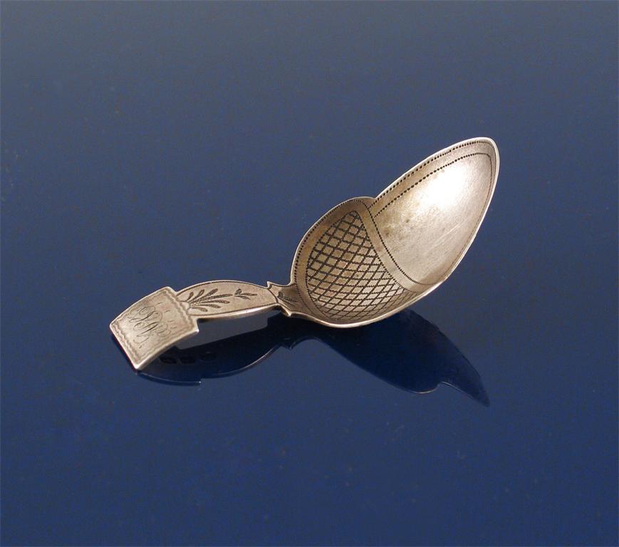 A George III engraved caddy spoon, with an acorn shaped bowl, a shaped stem and a square terminal, initialled "ALC", by Elizabeth Morley, London 1810.