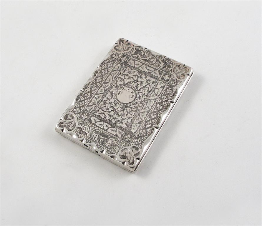 A Victorian engraved note case, with a silk lining and pencil, inscribed "Anne. F. Bon" & "1877", by Frederick Marsden, Birmingham 1874, (contained in a fitted case), 3.8in (9.7cm) high.