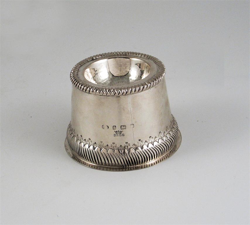 By the Duchess of Sutherland's Cripple Guild: a modern circular trencher salt, with chased, corded borders and a row of stamped trefoils above the foot, stamped with the coronet mark and hallmarked for Millicent Sutherland, Birmingham 1910, 2.5in (6.3cm) high, 3.25oz.