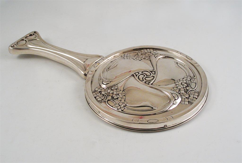 A modern hand mirror, with a fluid floral design on the back (designed by Kate Harris), by Messrs Hutton, Birmingham 1911 (loaded), 12.3in (31.5cm) long.
