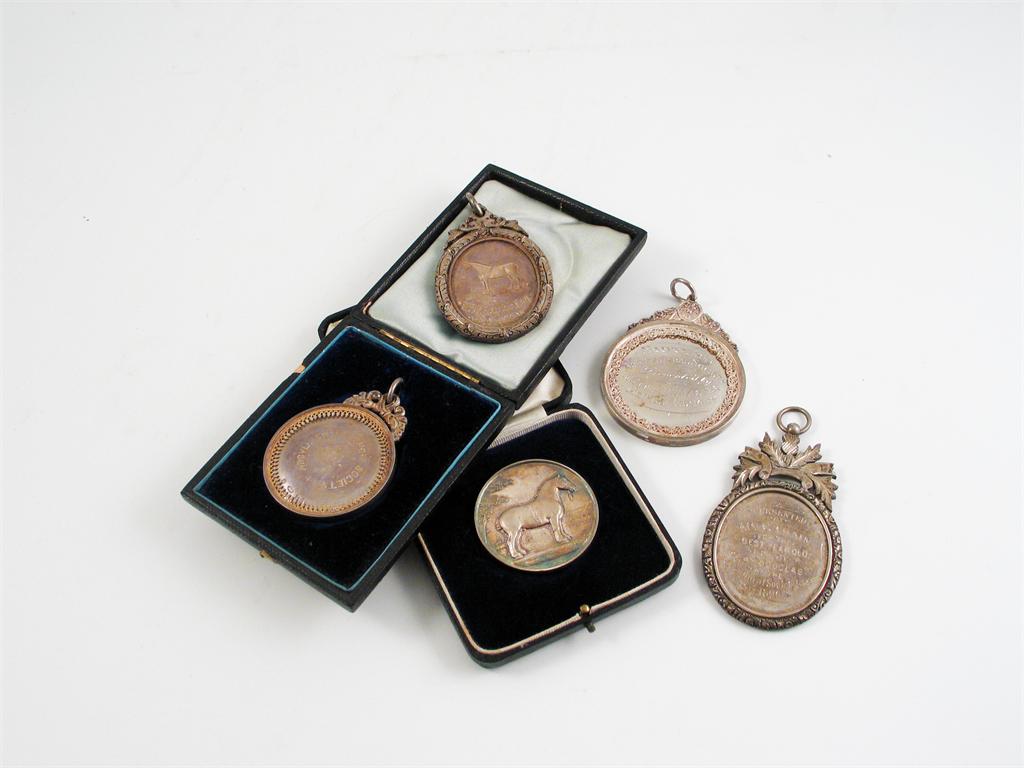 Five agricultural show medals: A Kintyre Agricultural Society medal for "yearling Filly 1931", a cased Scottish "Argyll Cattle Show Society medal 1892 for best roadster or Pony 3 years or under" on "Argyll Cattle Show oval medallion for the best yield mare or gelding....1886" a Campbeltown oval medal "for the best year old at the Ag. Soc. Show 1896" and a cased Kintyre Ag. Soc. medal presented for "best filly foal", 6.5oz. (5)