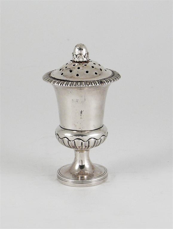 A 19th century Chinese Export pepper, of thistle form with a bud finial, a Chinese character mark on one side and pseudo marks under the foot (for London 1810) mid 19th century, 3.75in (9.5cm) high, 3.25oz.