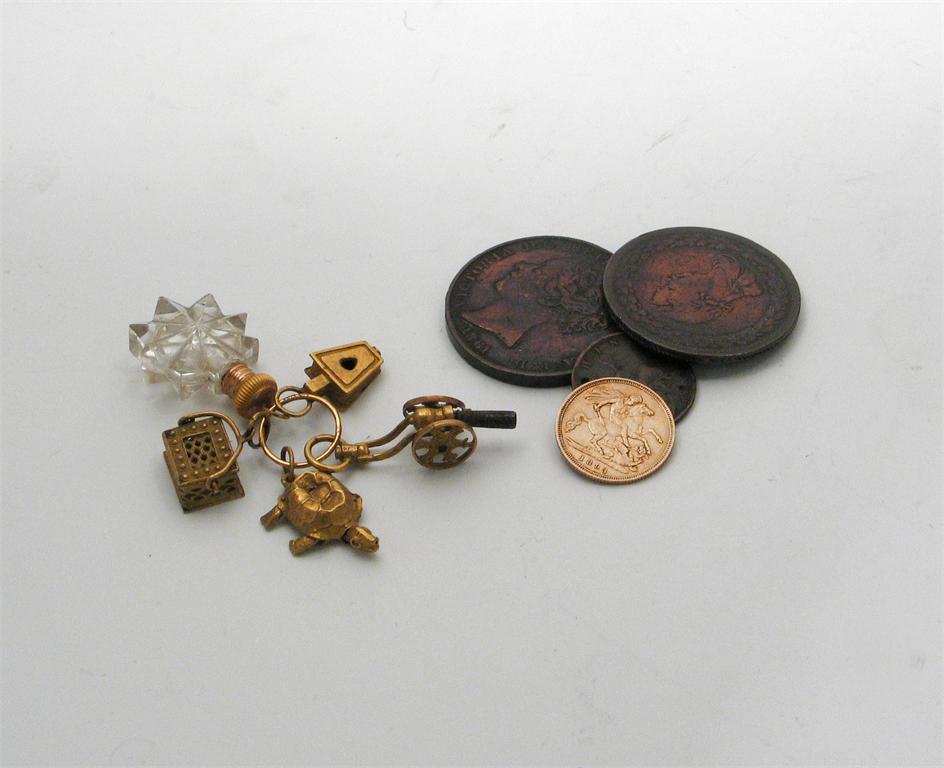 A mixed lot: five gilt-metal charms, on a ring (including a watch key in the form of a cannon), a Victorian gold half sovereign 1893, a States of Jersey1/13 of a shilling, a penny token and a farthing. (5)