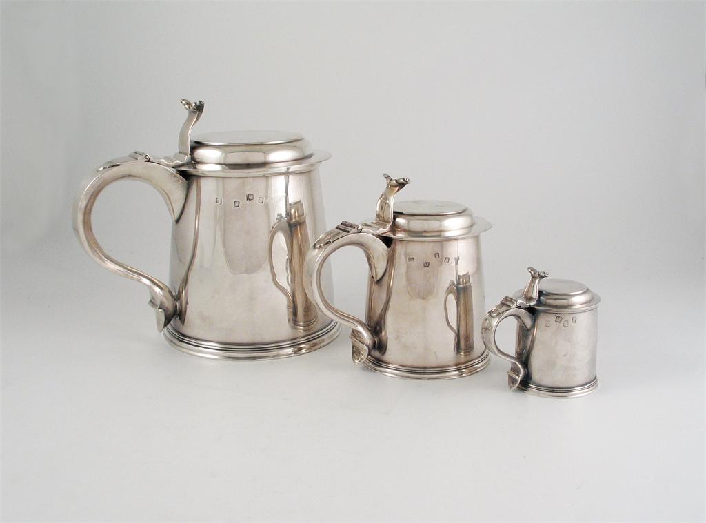 A matched set of three graduated Irish tankards, with tapering bodies, large scroll handles and broad brimmed covers, by the Royal Irish Silver Co, Dublin 1968/72, the largest 8in (20.3cm) high, 71oz. (3)