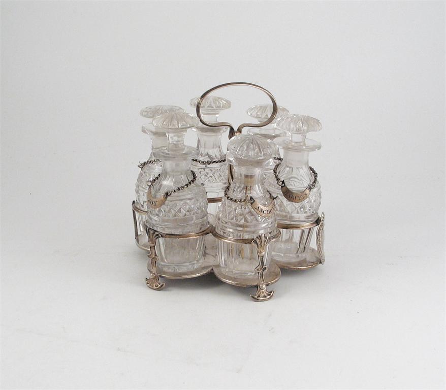 A George III soy frame, of hexafoil outline fitted with six later cut glass stoppered bottles and engraved on the cartouche with a crest and an Earl's coronet, each bottle hung with a crescent shaped sauce label "SOY", "CAYENNE", "CHILLI", "TARRAGON", "HARVEY'S", ANCHOVY", the labels, by John Robins c.1800, one only with a maker's mark, the frame by Robert Peaston, London 1764, the cruet 5.75in (14.5cm) high, 8.5oz weighable silver.