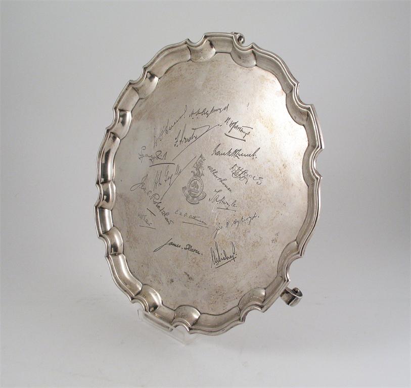Regimental Interest: a modern salver, of shaped circular outline with a moulded border, engraved in the centre with the badge of the Duke of Wellington's Regiment flanked by numerous facsimile signatures, by Adie Bros Ltd, Birmingham 1925, 12.2in (31cm) diameter, 30oz.