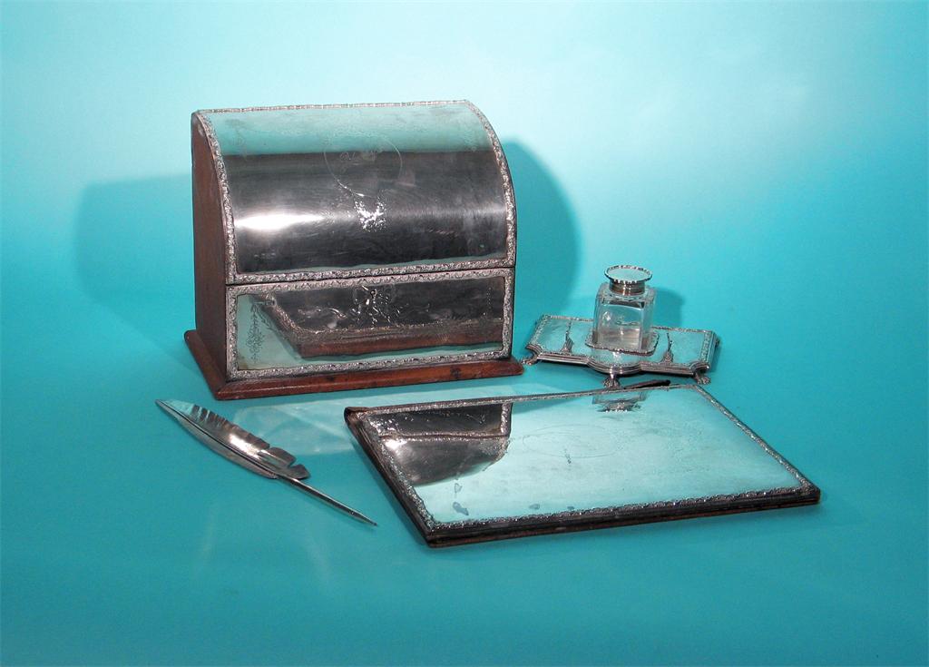 An Edwardian part desk set comprising: a mounted leather stationery box with a hinged, curved front, a mounted blotter and an inkstand with central bottle, each piece with engraving and inscribed "Gladys", by Goldsmiths & Silversmiths Co Ltd, London 1907 together with a modern Italian quill biro, the blotter 9in x 12in (23 x 30cm). (4)