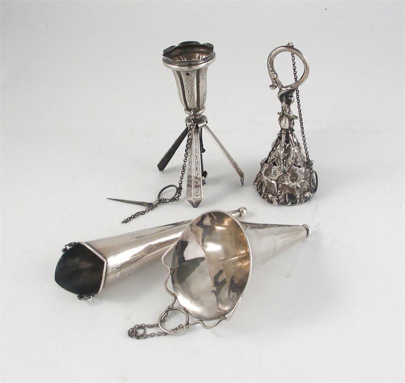 Four posy holders: A Victorian example, with stamped floral decoration, chain and finger ring, and a loop handle, inscribed "L R Aug't 12th 1869", unmarked, 5in (12.8cm); another late 19th century example with engraving and the handle which forms three legs for support (needs attention); a conical example by A D & Lovekin, Birmingham, 1912 and another similar trumpet shaped example by S Blackensee & Sons, Birmingham, 1910, (4), 4oz in total.