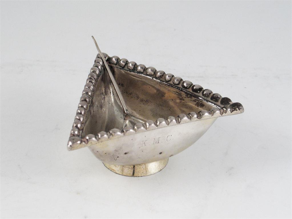 A reproduction of the Traprain triangle salt and a spoon to match, by Brook & Son, Edinburgh 1927, the latter, 4.1in (10.4cm) long, 4oz. (2)