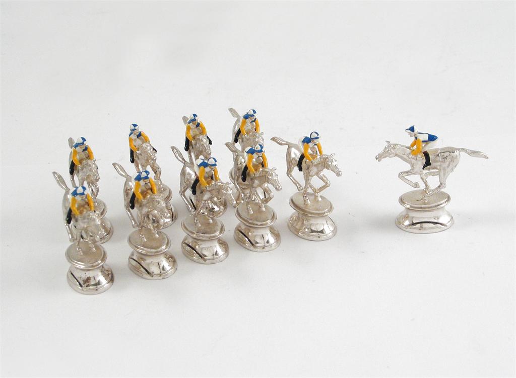 A modern set of ten cast, place card holders, in the form of a racehorse galloping, surmounted by a jockey wearing blue, white and yellow enamelled silks, maker "TF", London 1986, 1.75in (4.5cm) high, 8oz. (10)