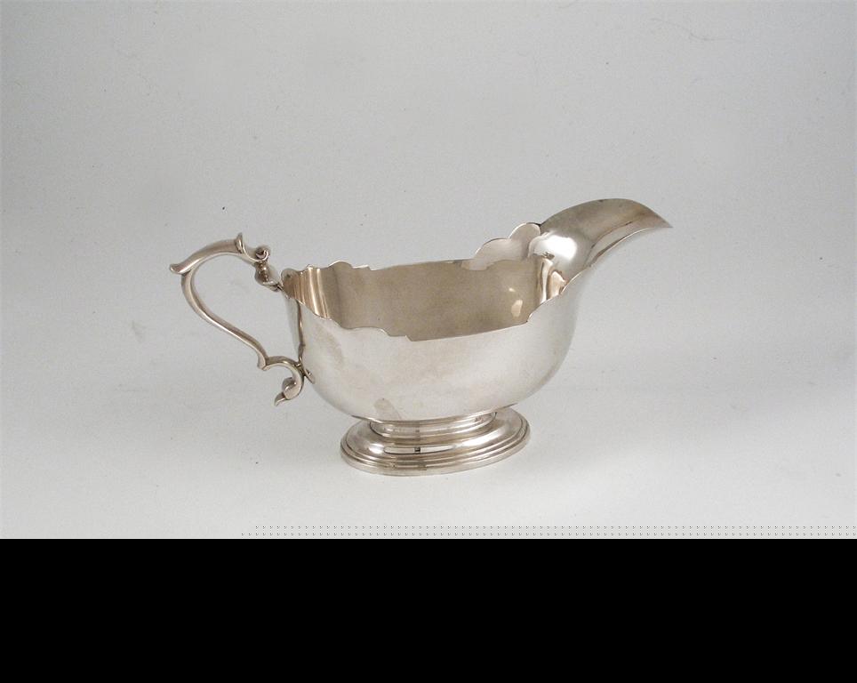 A modern sauceboat, on an oval foot with a shaped rim, by the Goldsmiths & Silversmiths Co Ltd, London 1938, 8.25in (21cm) wide, 11oz.