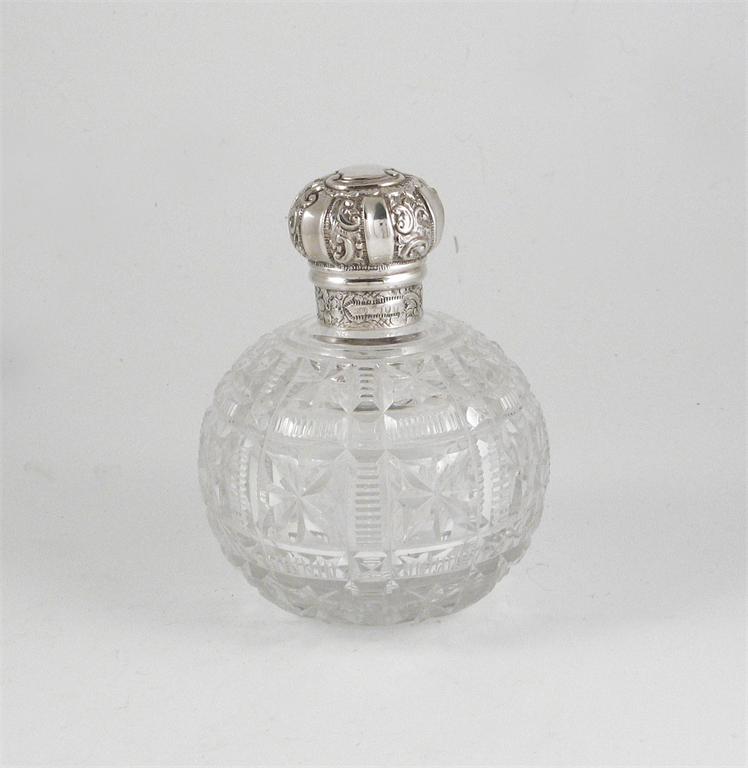 A late Victorian mounted cut glass globular toilet water bottle, with an embossed, screw cover and glass stopper, maker M.J. Jessop, London 1893, 5.9in (15cm) high.
