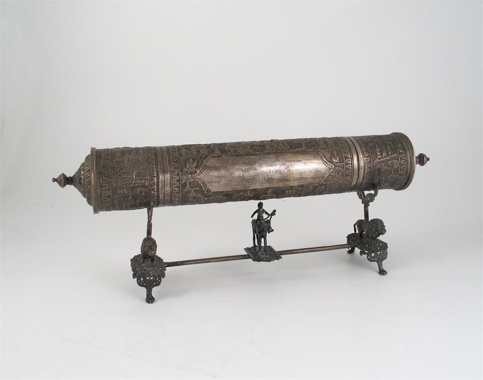 African Interest: an embossed scroll holder on a stand, with cast lion supports and a central horseman inscribed "Presented to his Honour - Sir Robert W. Hamilton KT Chief Justice East Africa Protectorate by the Arabs. Swahilis and Baluchis of Mombasa, containing a scroll, signed and dated 1919, 17in (43cm) long, 23oz.
