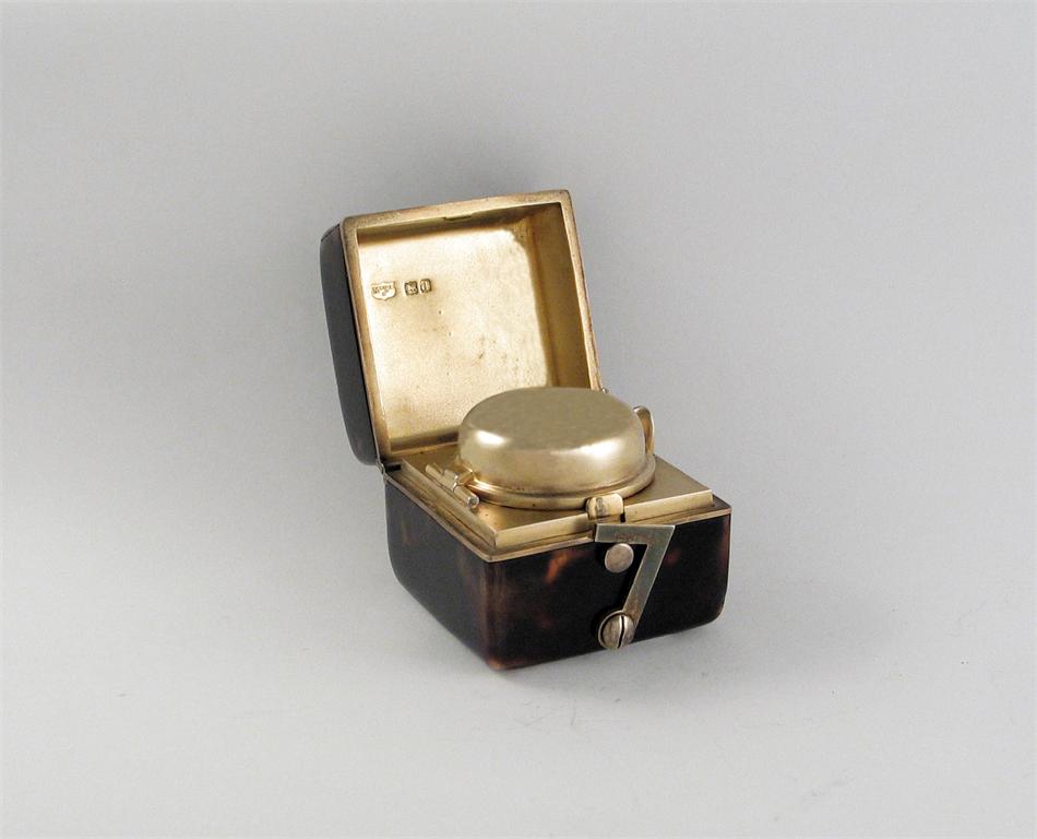 A late Victorian silvergilt mounted tortoiseshell travelling inkwell, cuboid with a latch fastening cover, and a sprung cover to retain the ink, by Mappin & Webb, London, 1899, 1.8in (4.5cm).