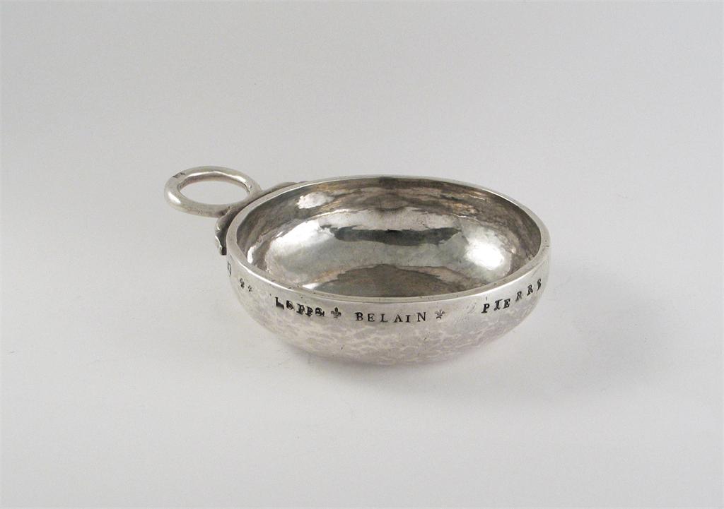 An 18th century French wine taster, with a serpent ring handle and the stamped, incuse inscription "L? IPP o BELAIN o PIERRE", maker's mark "S.I.F", Tours 1780-89, 3.15in (8cm) diameter, 2oz.