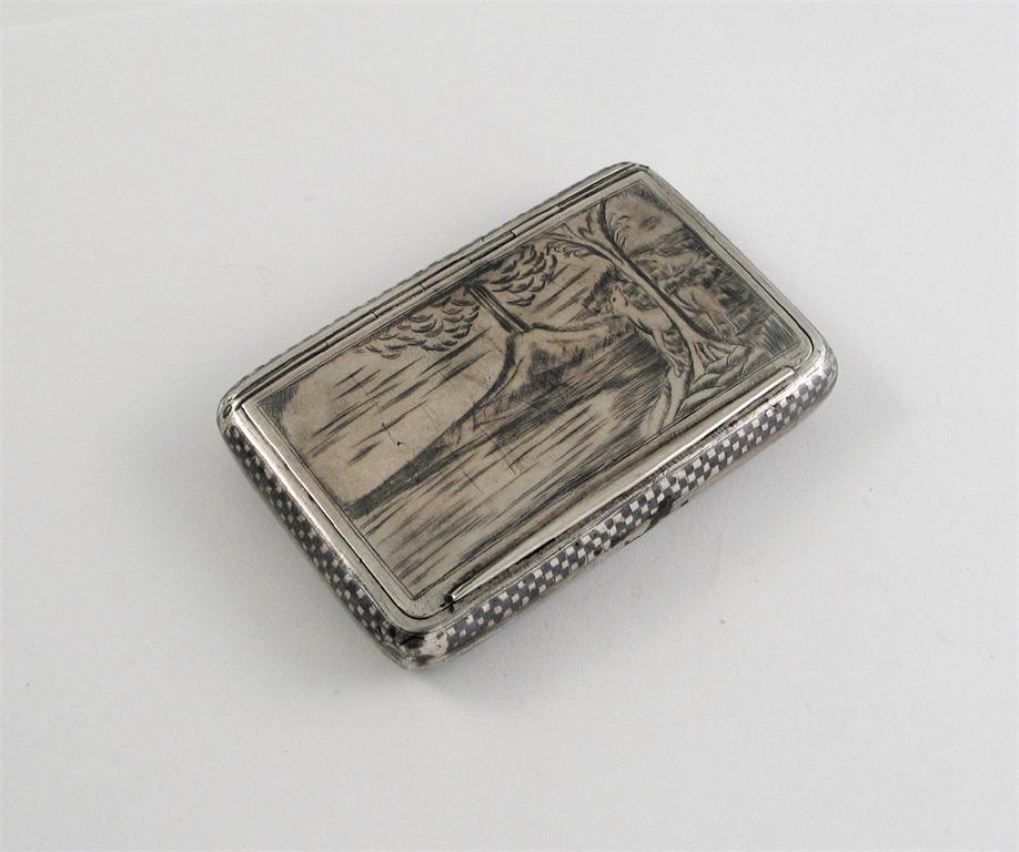 A 19th century continental niellwork tobacco box, of rounded oblong form with chequerwork around the sides and base centred by a floral spray, the cover with a view of an erupting volcano and a browsing animal in the foreground, unmarked, probably middle Eastern/Caucasian 1830-1840, 4in (10cm) wide, 4oz.