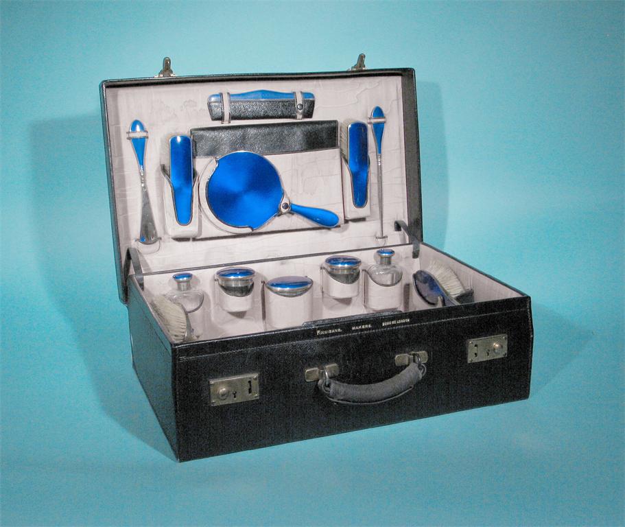 A modern leather dressing case fitted with the following silvergilt and deep blue enamelled items: a hand mirror, four brushes, a comb, a mounted steel button hook, a shoe horn, six assorted bottles/jars, a nail file, a pair of tweezers, a lipstick holder, a nail buffer, a jar mount (no jar) and a leather blotter, (together with a four piece tortoiseshell brush set) the mounts by H. Mathews, Birmingham 1925/1926. The case initialled "I.C", 21in (53cm) wide.