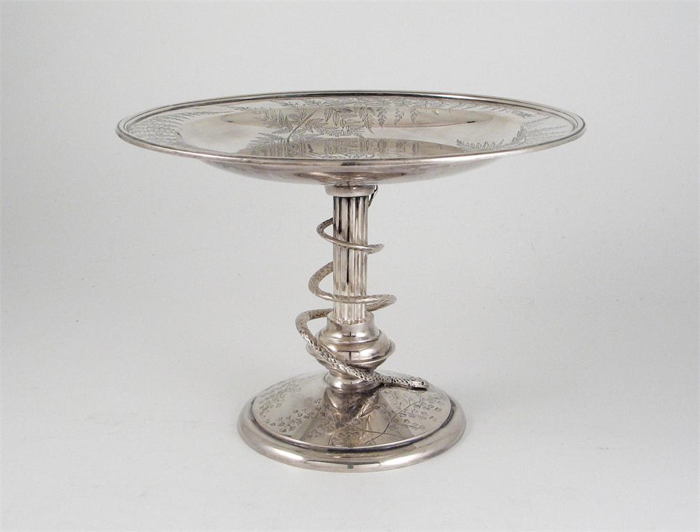 A Victorian tazza, with fern engraving and a fluted column with a coiled serpent descending around it, by Stephen Smith, London 1868, 9.25in (23.3cm) diameter, 20oz.