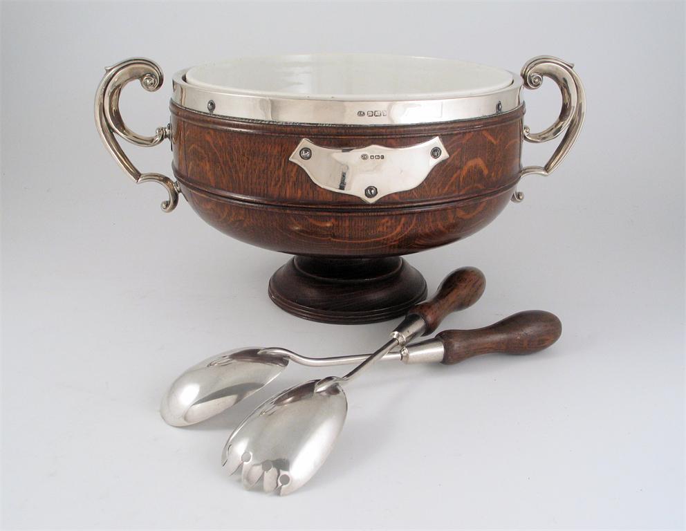 A modern mounted oak salad bowl, with two, harp-shaped handles, an applied vacant shield and a pottery liner, by John Round, Sheffield 1911, 9.3in (23.5cm) diameter together with a pair of oak handled salad servers, by T. Latham & E. Morton, Birmingham 1902. (3)