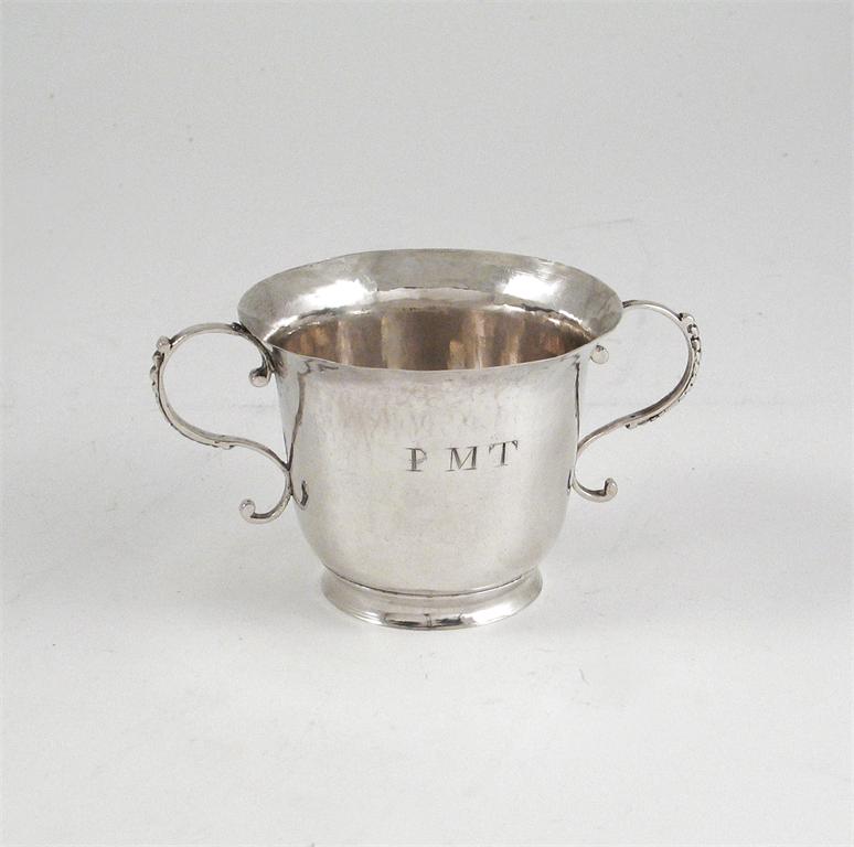 Channel Isles: a late 18th century two handled cup, of plain campana form on a collet feet, scratched "PMT" on one side, maker's mark only "I.D" struck four times, by J. Pierre Duport, Geurnsey c.1785, 2.5in (6.3cm) high, 2oz.