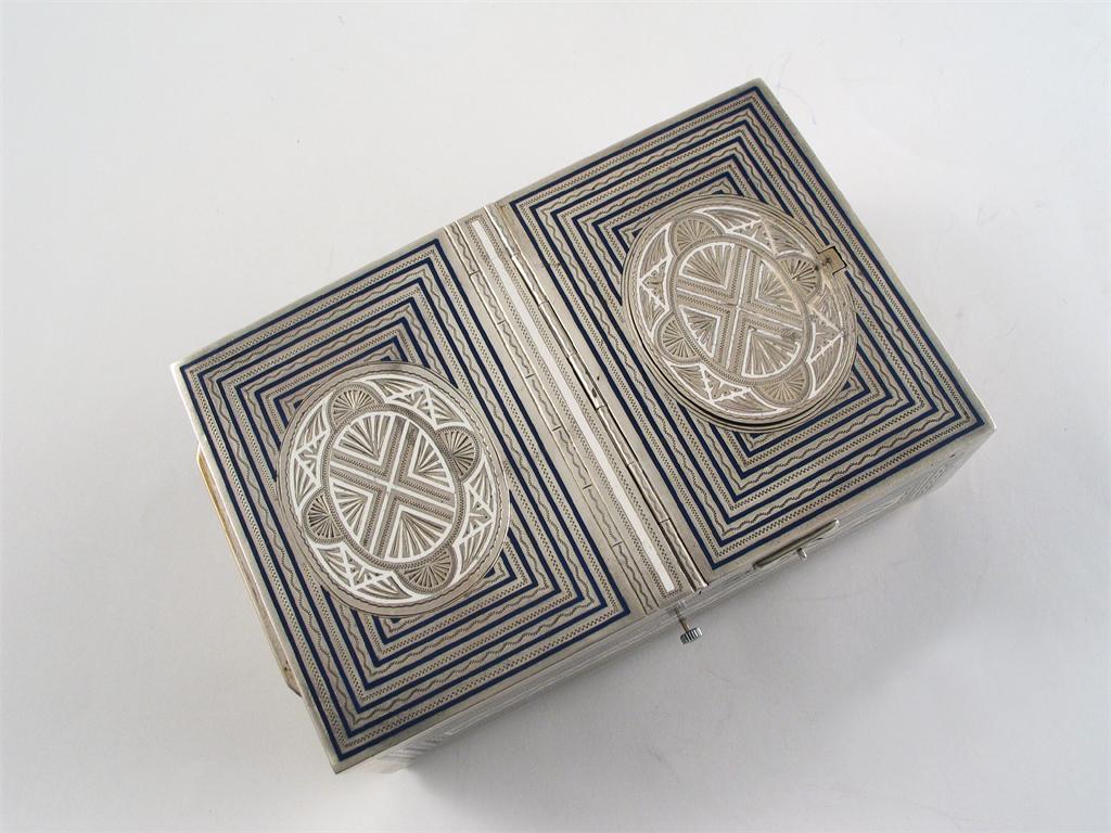A 20th century continental singing bird and musical erotic automation box, of plain oblong form enamelled with white and royal blue linear decoration, and resting on bracket feet, the hinged cover revealling his naked lovers engaged in a live performance in time with the music, unmarked, 5.5in (14cm) wide.