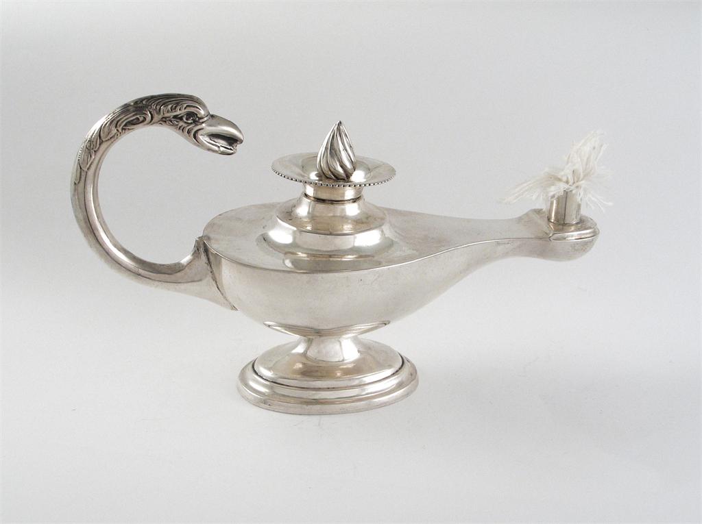 A modern spirit lighter, in the form of a classical lamp with a bird mask handle, maker's mark distorted, Birmingham 1926, 6.3in (16cm) long, 4oz.