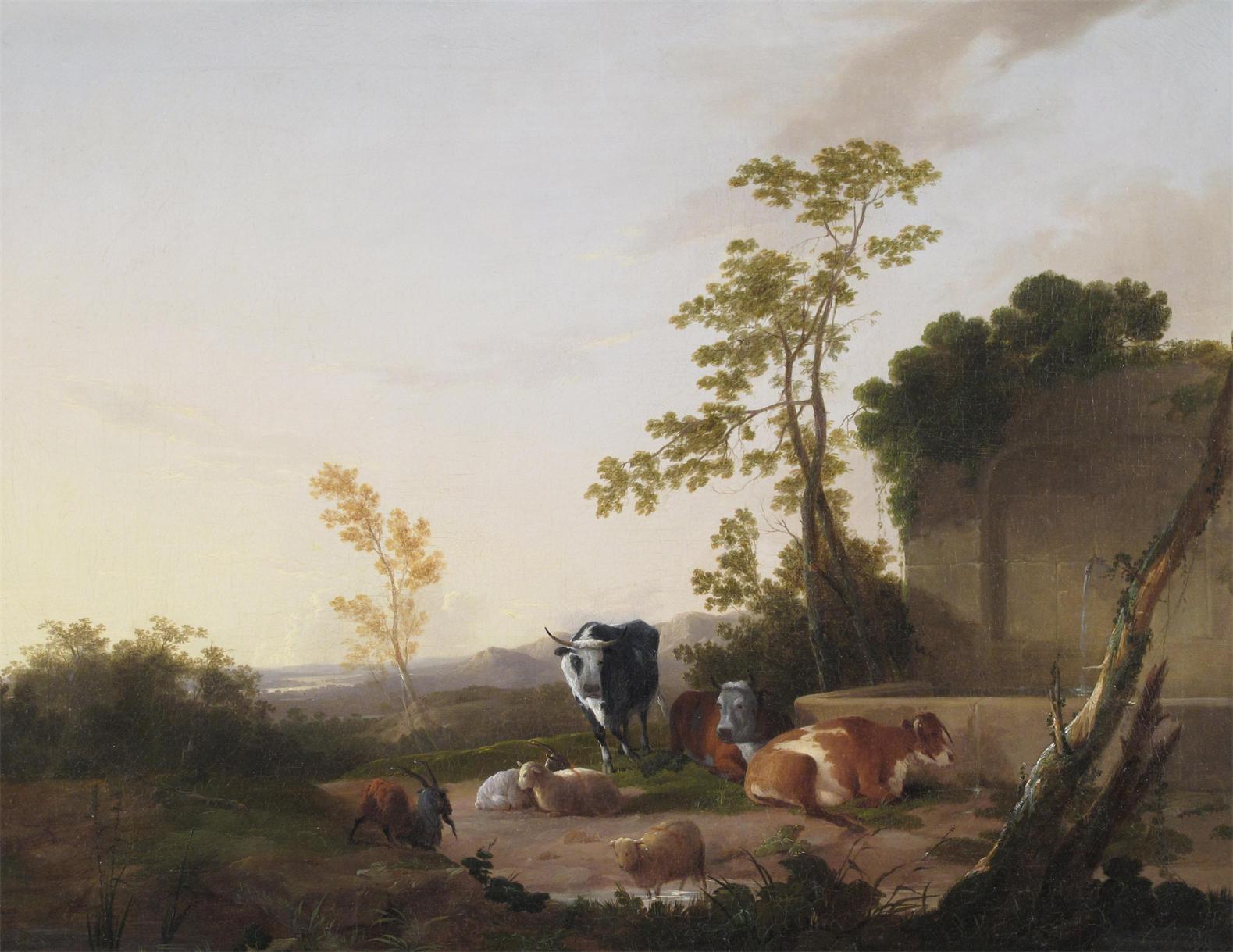 James Baker Pyne (1800-1870) Cattle by well in a mountainous landscape Signed and dated 1824 Oil on canvas 53 x 69cm; 21 x 27¼in