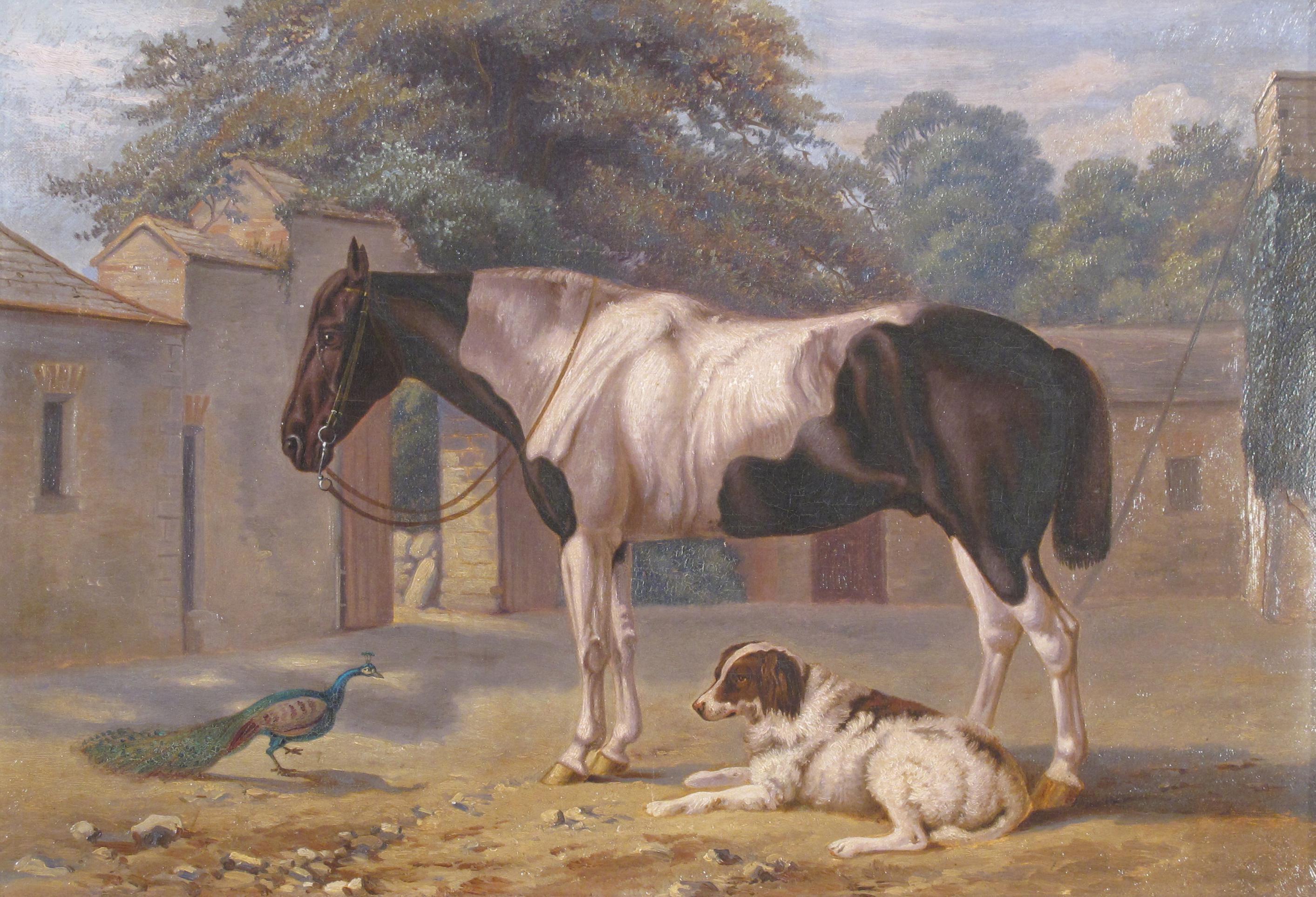 English School 19th Century A horse, a dog and a peacock in a stable yard Oil on canvas 39 x 56cm; 15½ x 22in