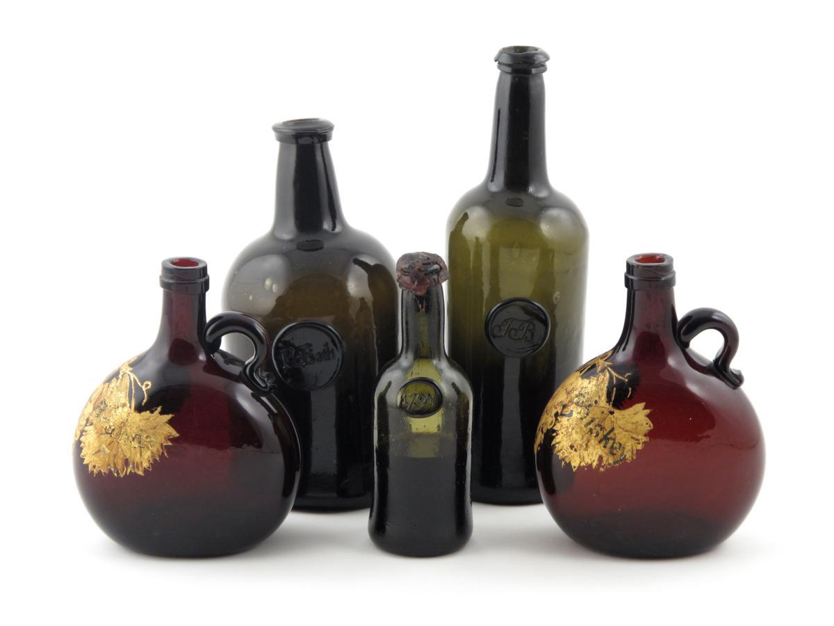 Three sealed wine bottles late 18th / early 19th century, one bearing the initials 'JB', one of squat shape for 'R Bath', and a small bottle dated 1791, and two decanters gilded with grapes and vine leaves titled 'Whiskey' and 'Brandy', 28cm max. (5)