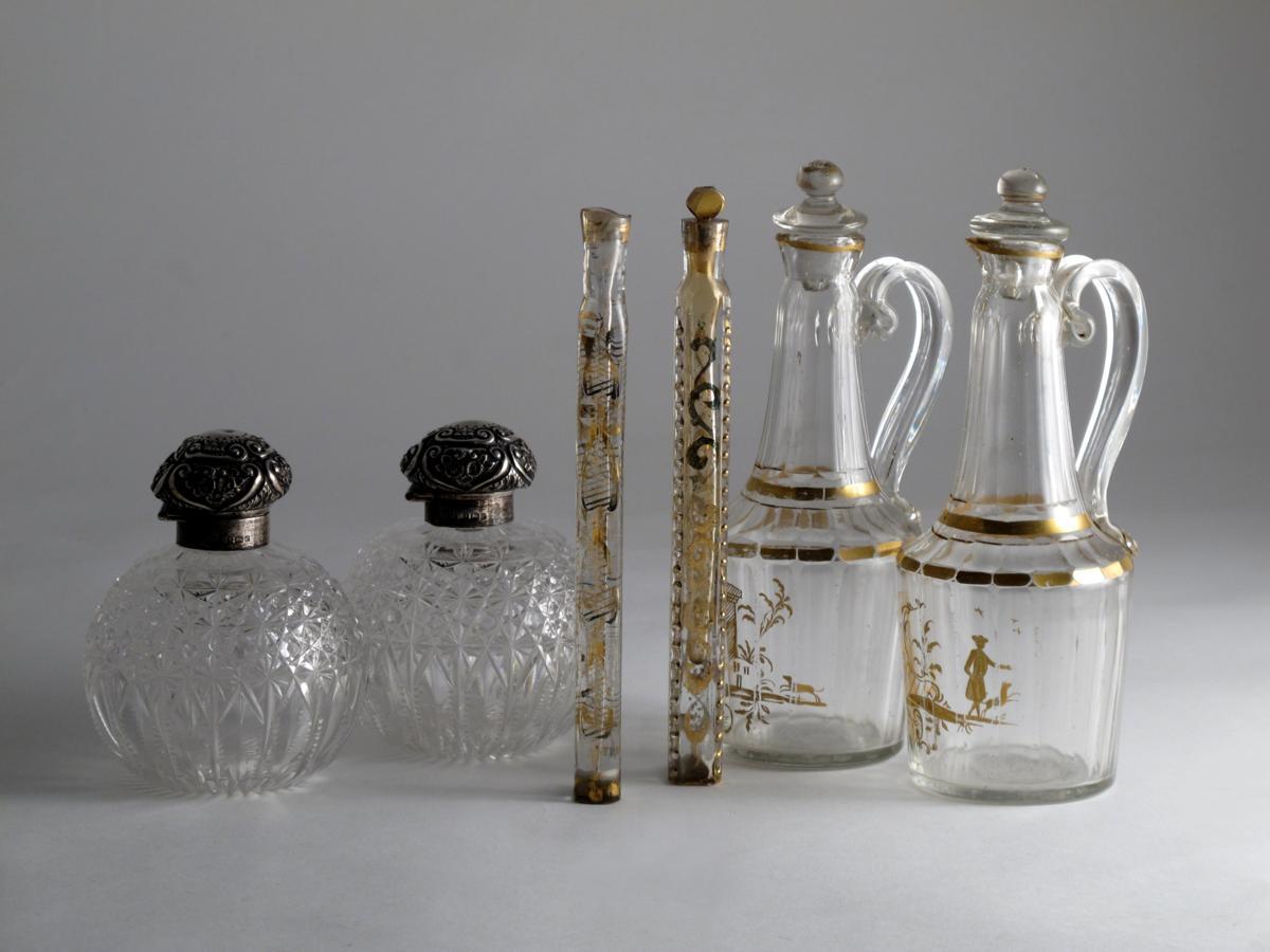 Two cut glass silver-mounted scent bottles, hallmarks for George Unite, Birmingham 1904, a pair of gilded glass jugs and stoppers, decorated with dogs and figures, and two long glass gilded scent bottles, one with a stopper, some faults, 19.7cm max. (9)