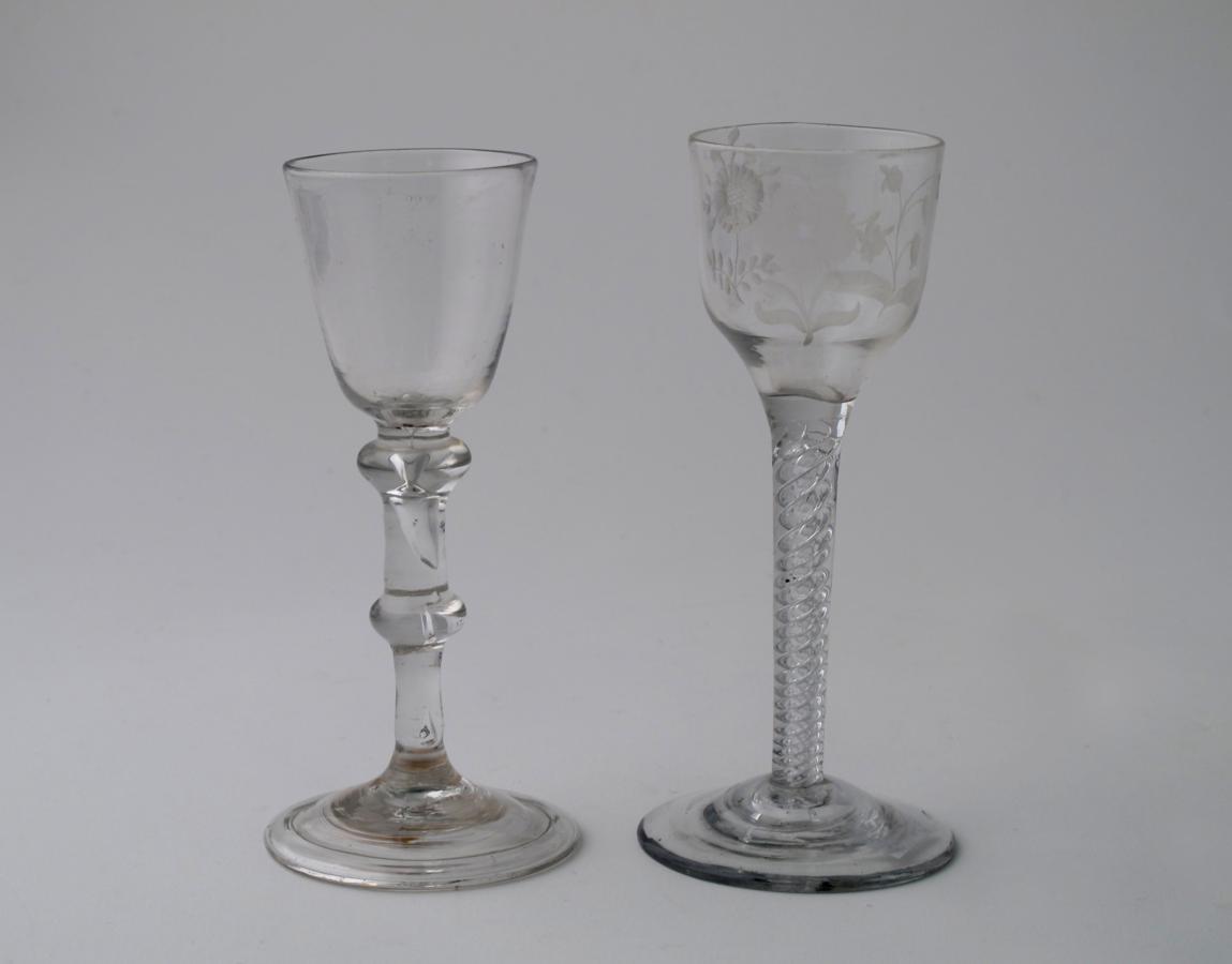An engraved wine glass of Jacobite type mid 18th century, engraved with a rose and raised on an airtwist stem, and another wine raised on a double-knopped stem and folded foot, 15.2cm max. (2)