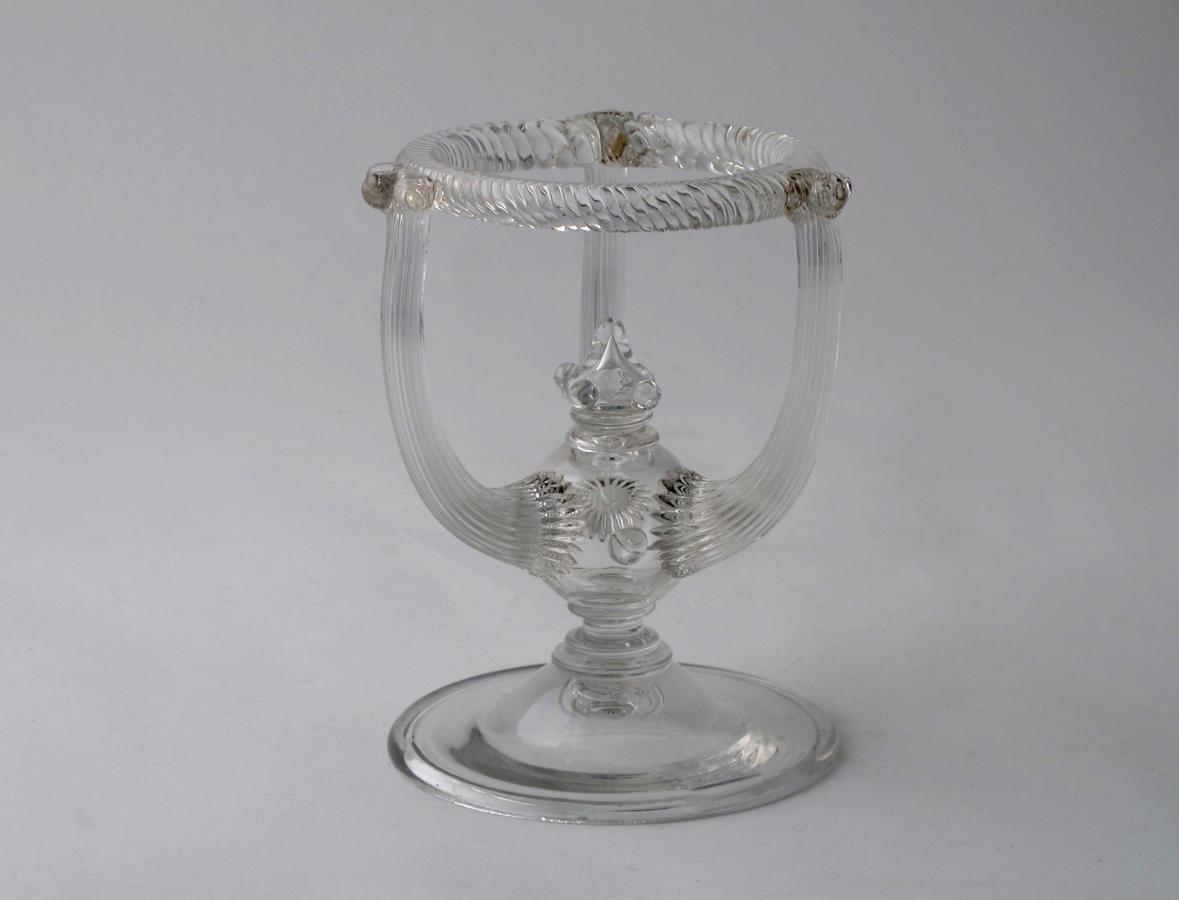 A Thomas Webb & Sons glass stand c.1867, raised on a low folded foot, with three ribbed arms raising to a circular twisted band, engraved registration diamond, small chips, 16cm.