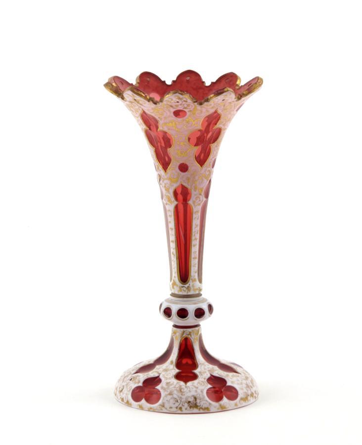 A Bohemian glass vase 19th century, ruby-flashed and overlaid with white and a scrolling gilt design, a little gilt wear, 26cm.