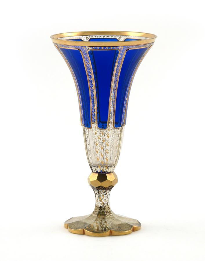 A Venetian glass vase, flashed with blue panels between gilt seaweed and foliate bands, the short stem with a faceted gilt knop, 27.5cm.