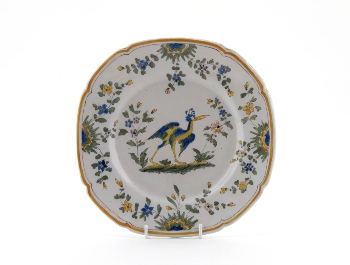 A Moustiers faïence dish 18th century, painted probably by Foque with a grotesque wading bird amongst trailing flowers, painted F mark to the reverse, 22cm.