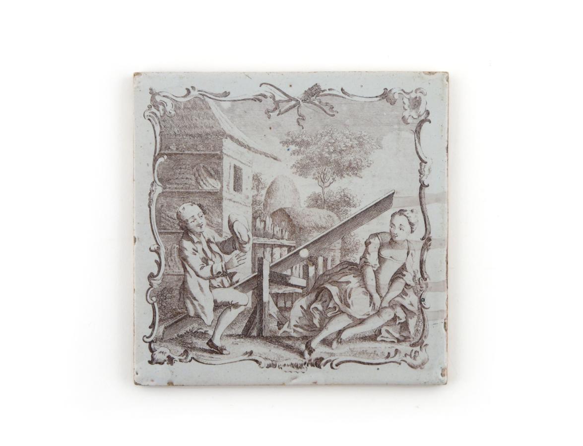 An early Liverpool delftware Sadler printed tile c.1757-61, decorated in sepia with The See-Saw, the young lady gathering her skirts about her while her companion sits at one end of a wooden plank, 12.5cm.