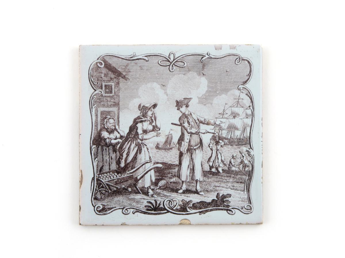 An early Liverpool delftware Sadler printed tile c.1757-61, printed in manganese with The Sailor's Farewell, the sea-faring young man reasoning with his tearful sweetheart while his companions call him to the ship, a small chip to one edge, 12.8cm.
