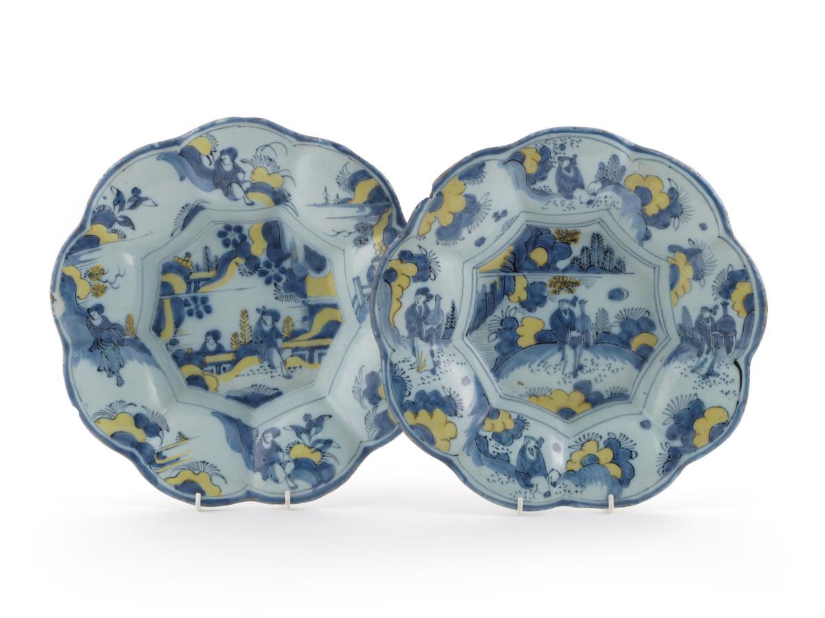 A good pair of Delft lobed dishes 18th century, painted in blue and yellow with Oriental figures seated or standing in garden scenes, 35cm. (2)