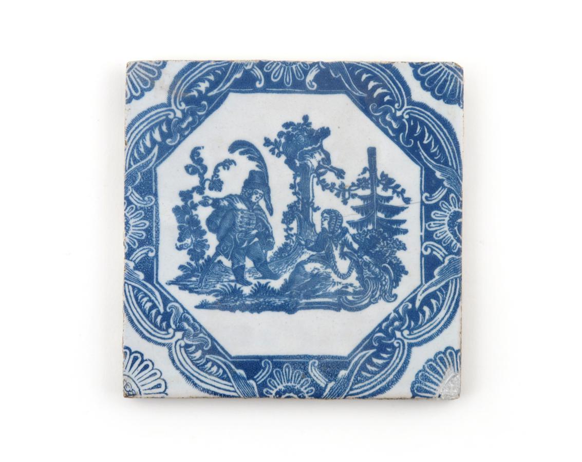 A Liverpool delftware Sadler woodblock tile c.1756, printed in blue with a soldier in a large plumed hat, conversing with a seated lady, within a wide scrolling border, a chip to one corner, 12.5cm.