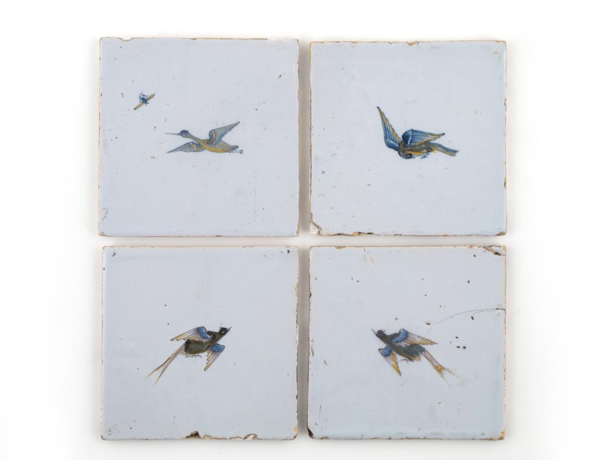 Four delftware bird tiles c.1755-75, probably Liverpool, each decorated with a central bird in flight, detailed in shades of yellow, blue, green and manganese, one cracked, 13cm. (4)