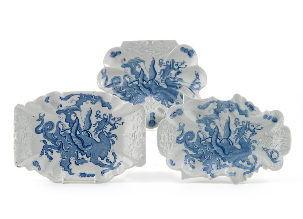 Three Mason's Ironstone shaped dishes 19th century, the three differing elaborate forms printed with large winged dragons, printed and impressed marks, 28.5cm max. (3)