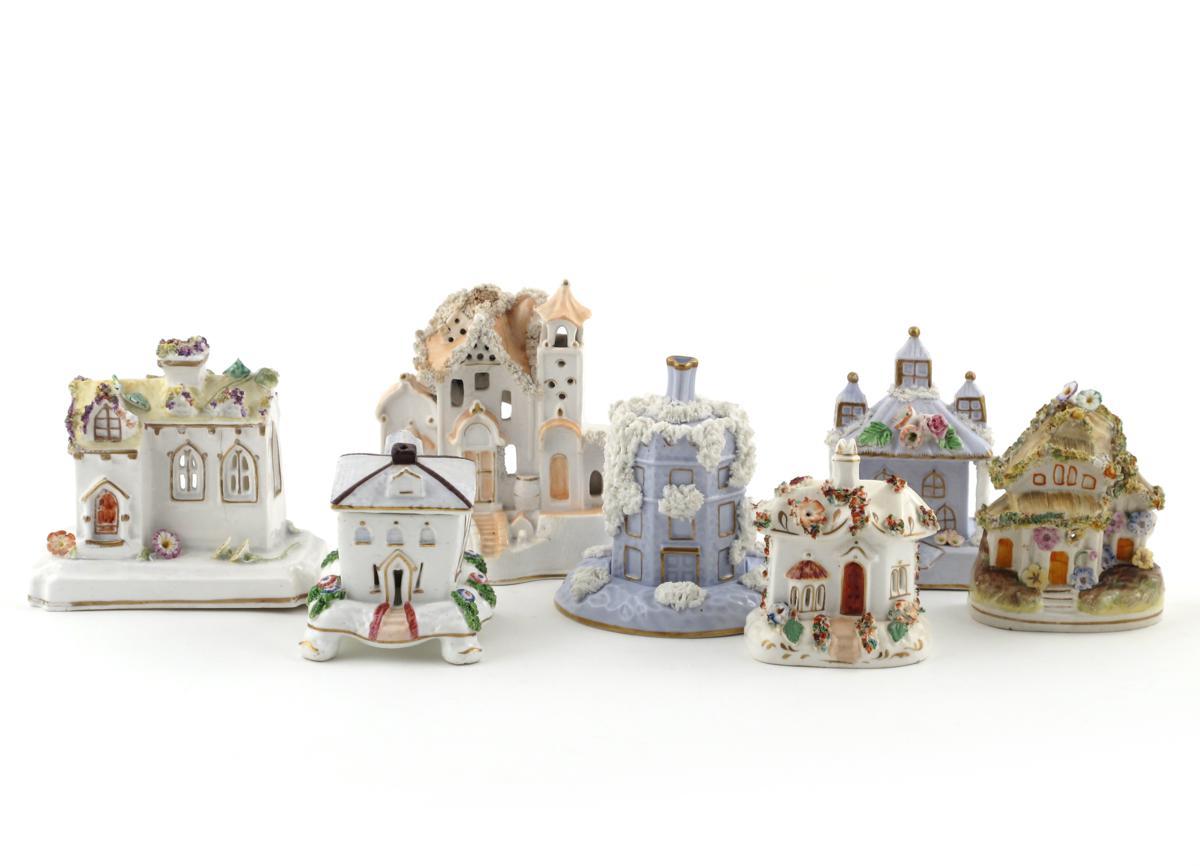Seven Staffordshire pastille burners 19th century, modelled as cottages and other buildings, encrusted with moss and applied flowers, two of a lavender ground, one with an impressed 2 mark, 15.3cm. (9)