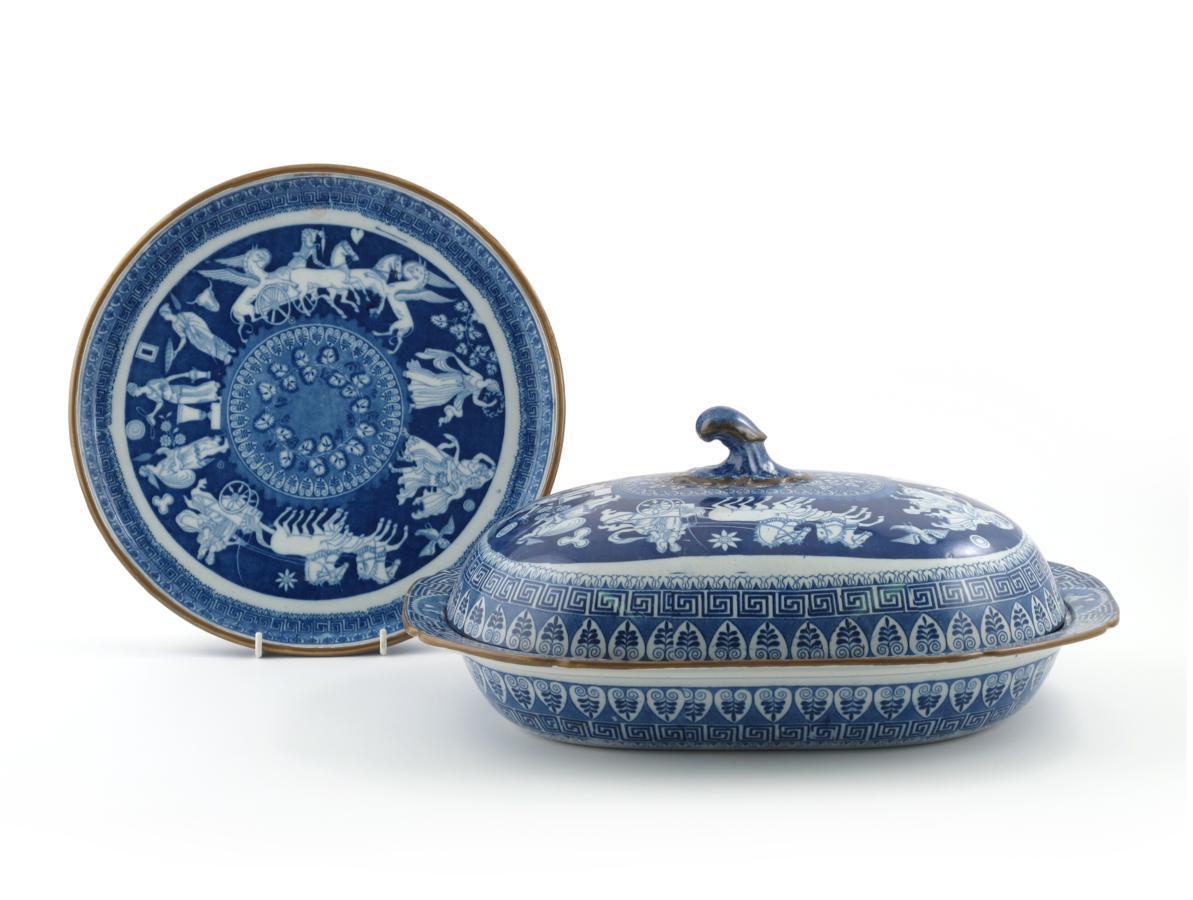 A large pearlware blue and white tureen and cover 19th century, printed with Classical figures and winged chariots, and a matching circular stand, 43cm max. (3)