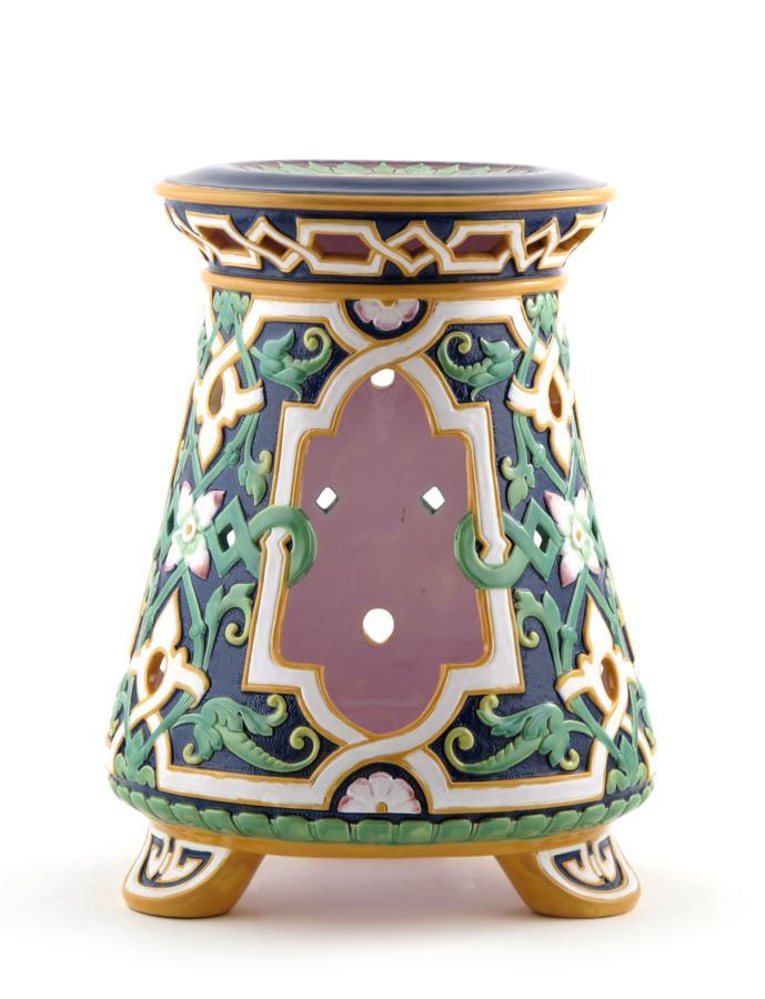 A good Minton Majolica garden seat c.1863, of shape 940, the tapering sides pierced in the Islamic style with three shaped panels around moulded endless knots and stylized foliage, decorated in a rich palette on a deep blue ground, the interior glazed a delicate mauve, impressed marks and date code, 44cm.