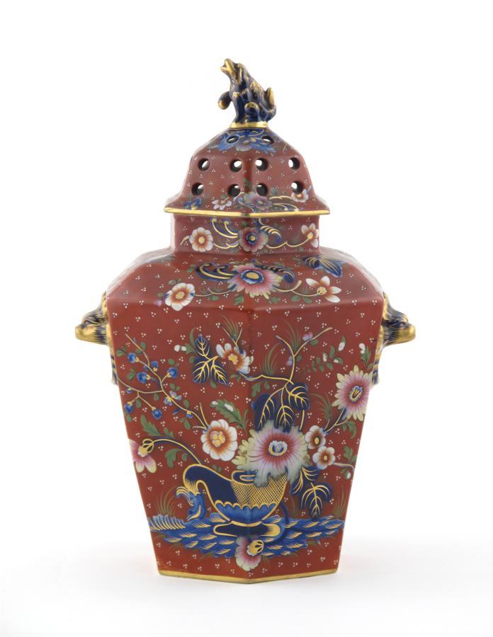 A large hexagonal stone china pot pourri vase and cover 2nd half 19th century, decorated in a Japan pattern of Oriental flowers on a brick red ground, the pierced cover with a lion dog finial, printed mark to the base, 45cm. (2)